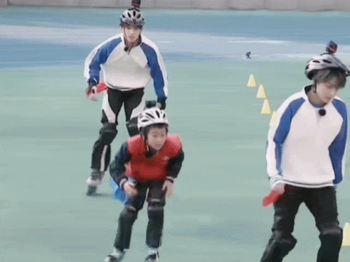 Liu Yuxin and Xin Liu roller skating with a young child, practicing with cones as part of the SUPER TEAM.