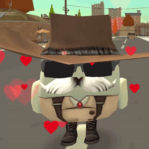 A Chicken Gun character, Den, wearing a hat and suspenders, is surrounded by floating red hearts.
