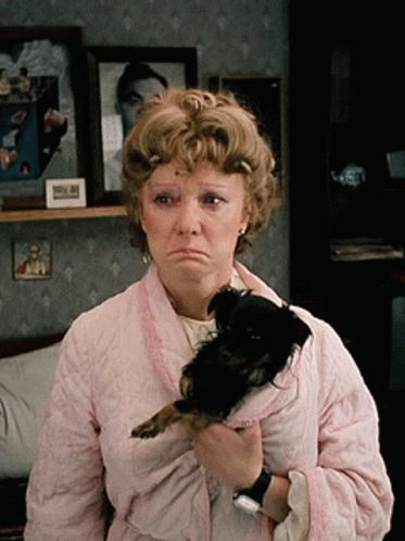 A woman in a pink robe with curlers in her hair holds a small black dog, looking sad and pensive.