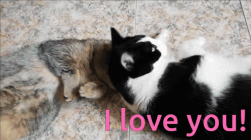 Two adorable cats share a sweet moment, with the text 'I love you!' displayed on screen.