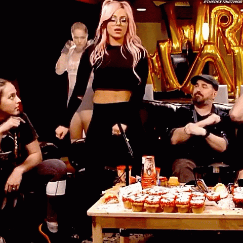 Liv Morgan performs the floss dance in a room with a table full of cupcakes and people watching.