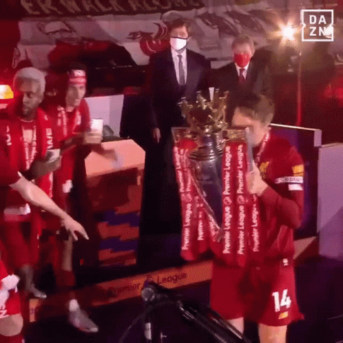 Jordan Henderson, captain of Liverpool FC, lifts the Premier League trophy with his teammates celebrating their victory.