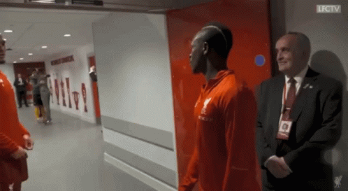 Sadio Mane interacts with a teammate in the Liverpool FC stadium hallway.