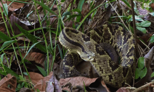 A rattlesnake coiled and camouflaged among dry leaves and green grass, subtly moving its head.