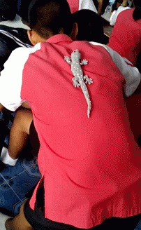 A person is seen from behind with a fake lizard placed on their back, wearing a pink shirt.