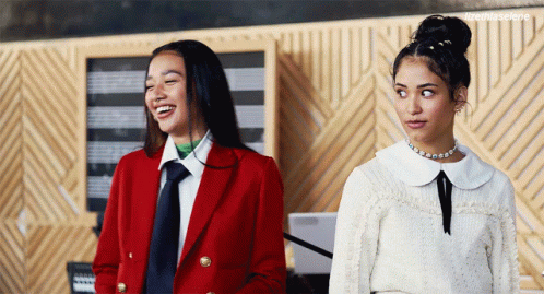 Lizeth Selene (MJ) laughing and Andi Agosti (Andrea Chaparro) making a funny face from Rebelde Netflix.