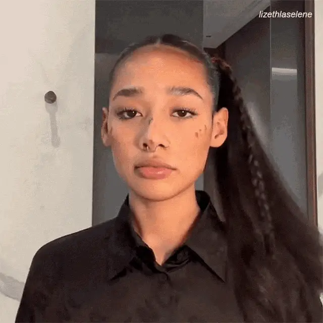 Lizeth Selene relaxing on a couch, wearing a cozy grey hoodie with a nose piercing.