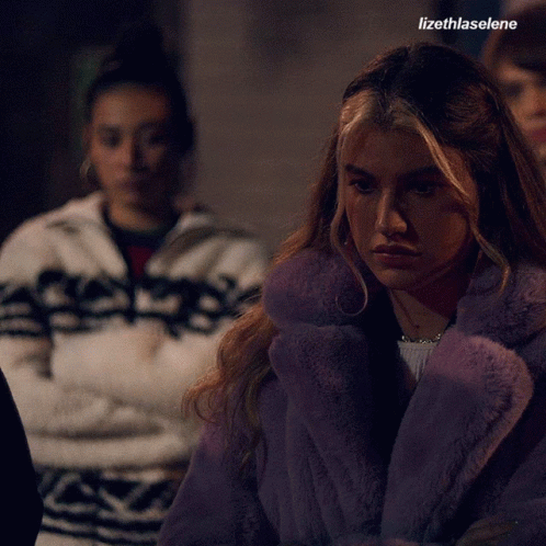 Lizeth Selene and another character from Rebelde Netflix, standing outdoors at night.
