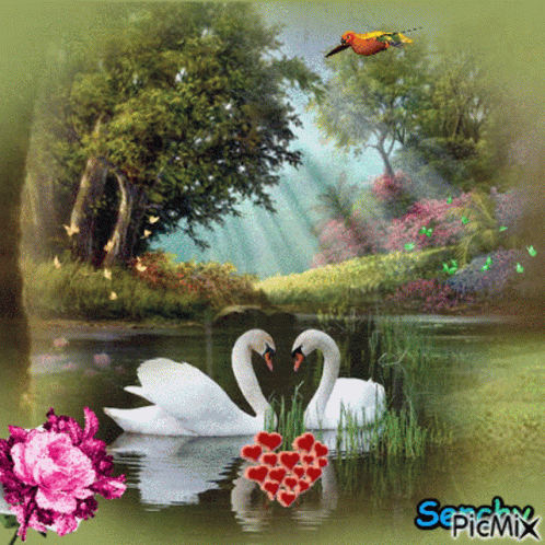 Two swans form a heart on a serene lake, surrounded by lush nature and a floating heart graphic.