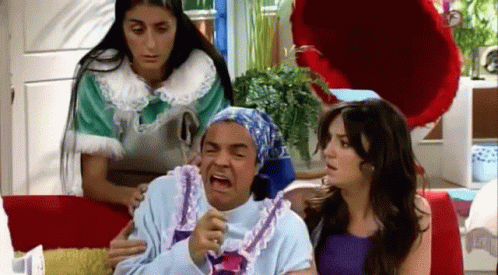 Ludovico Peluche, played by Eugenio Derbez, is shown crying dramatically while two women comfort him.