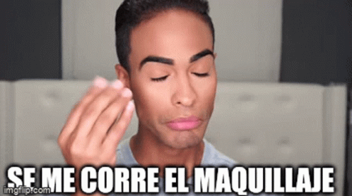 Pollito Tropical reacts as his makeup runs, making a dramatic expression and wiping his eye.