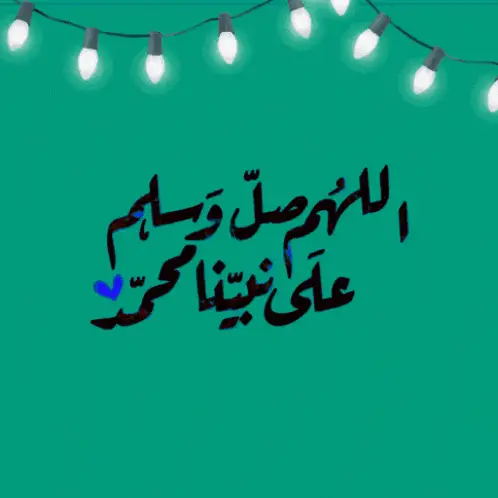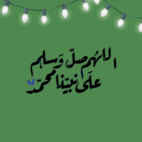 Arabic calligraphy of 'O Allah, send prayers and peace upon our Prophet Muhammad' on a green background with string lights.