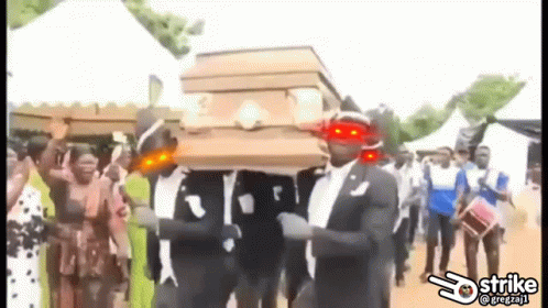 Men in suits perform the viral Coffin Dance meme with glowing eyes, featuring the Ln Strike Gregzaj1 watermark.