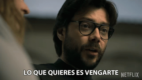 Alvaro Morte as El Profesor from La Casa De Papel says 'What you want is revenge' in an intense moment.
