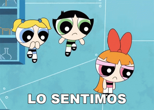 Blossom, Bubbles, and Buttercup from The Powerpuff Girls look apologetic, with Blossom in the foreground.