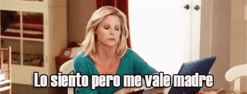 Woman with a laptop and phone, with the Spanish caption 'Lo siento pero me vale madre'.