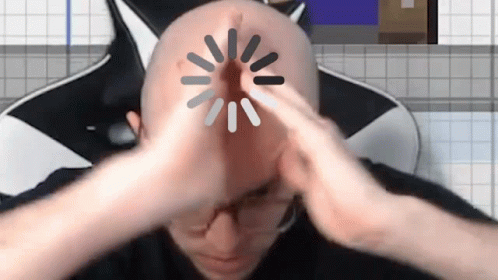 Esam, a bald man with glasses, holds his head as a loading icon spins on his forehead, symbolizing deep thought.