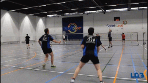 Players engage in an intense badminton match, showcasing powerful lob and smash shots on an indoor court.