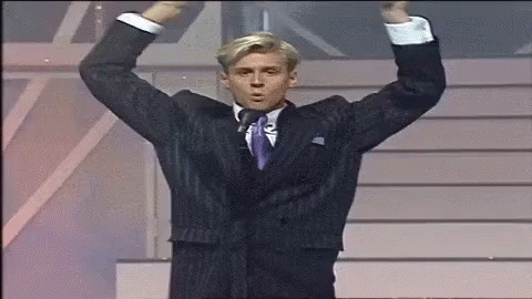 A Locomia member performs an energetic dance in a distinctive suit on stage, showcasing voguing elements.