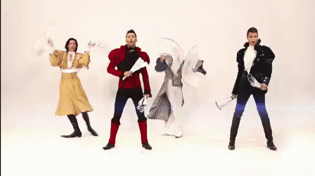 Locomia performs a vibrant dance routine in elaborate costumes, wielding large fans.