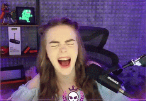 Streamer Loeya bursts into a loud, hilarious laugh while sitting at her gaming setup with a microphone.
