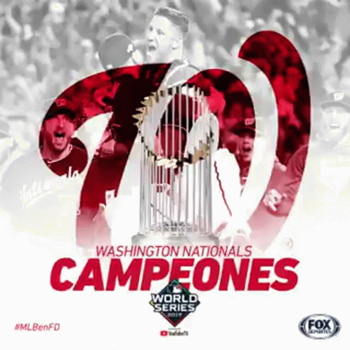 Washington Nationals celebrate their 2019 World Series championship, proudly displaying the trophy.