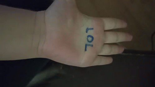 A person's hand with the word "LOL" written on the palm in blue marker.