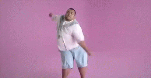 Man performs an energetic happy dance to Meghan Trainor's 'All About That Bass' against a pink background.