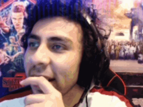 Aldrichplay, a streamer, laughs hysterically while wearing headphones in front of a Stranger Things poster.