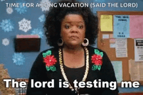 Woman expresses frustration, stating 'Time For A Long Vacation' and 'The Lord Is Testing Me'.