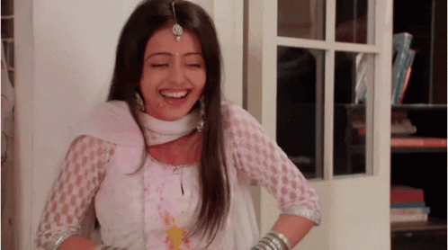 Shrenu laughs heartily, covered in color, in a white traditional outfit, celebrating Holi.