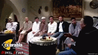 Egyptian actor Adel Imam shares a forced laugh during a scene from the 'Ferket Nagui Atalla' TV series, with other men present.