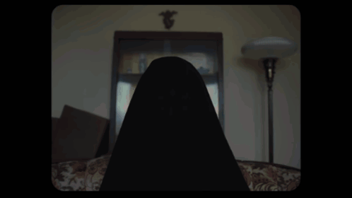 A young girl slowly rises and extends her arms in a dimly lit, vintage-style room, creating an eerie atmosphere, titled Longlegs.