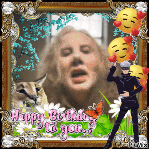 A unique birthday card featuring the Longlegs character, Gojo, a cat, and smiling emojis with hearts.