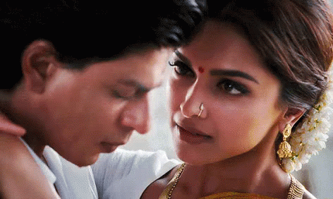 Deepika Padukone and Shah Rukh Khan share an intense gaze in a romantic scene from Chennai Express.