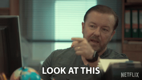 Ricky Gervais points and says 'Look at this' while sitting at a desk, referencing his show After Life.