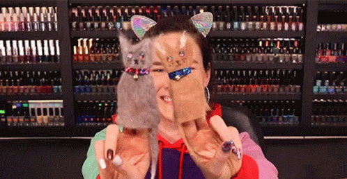 Simply Nailogical, wearing cat ears, smiles brightly while showcasing two cute cat finger puppets.