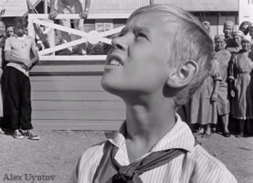 A young boy in a striped shirt and pioneer scarf looks up with an expression of wonder.