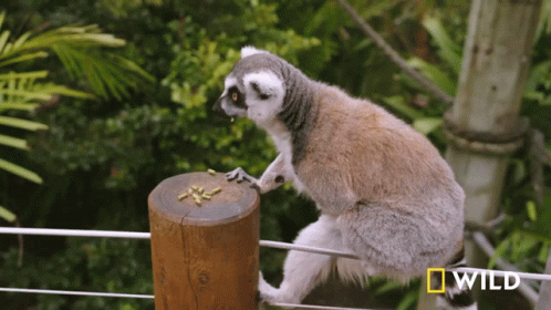 A ring-tailed lemur carefully picks up and eats small pieces of food from a wooden post, featured on National Geographic Wild.