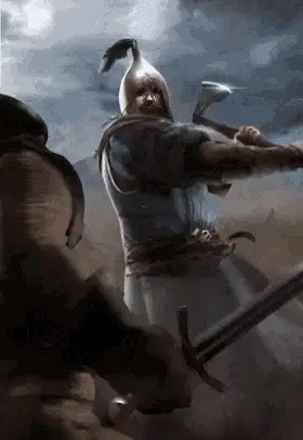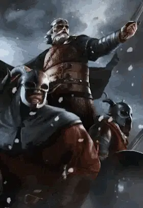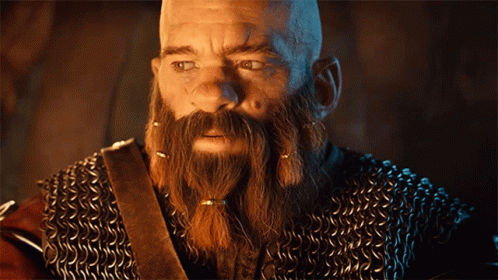 Zoltan Chivay, a bald man with a braided beard and chain mail, looks intently to the side.