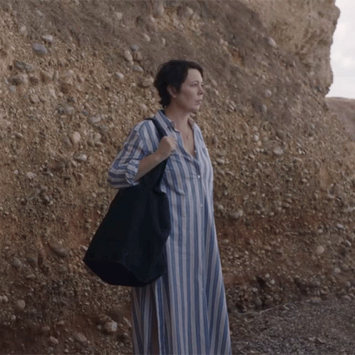 Olivia Colman as Leda Caruso, wearing a striped dress, stands by a rocky cliff, looking into the distance.