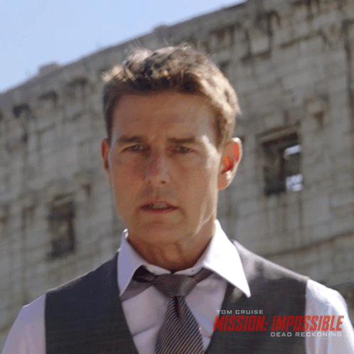 Tom Cruise as Ethan Hunt from Mission: Impossible Dead Reckoning looking intently at the camera.