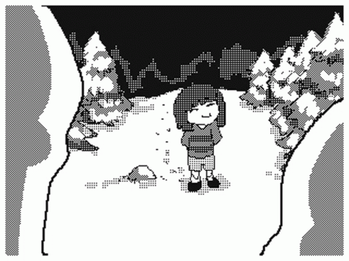 Frisk, Sans, and Papyrus from Undertale stand in a snowy landscape, looking at each other in pixel art style.