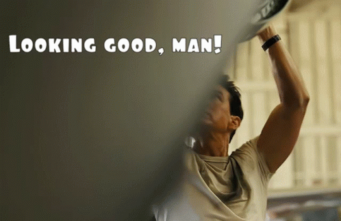 Tom Cruise as Maverick, working on machinery in a hangar, with the caption 'LOOKING GOOD, MAN!' displayed.