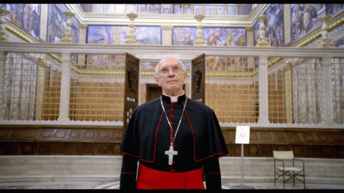 Jonathan Pryce as a cardinal, wearing robes and a cross, stands in an ornate room from The Two Popes.