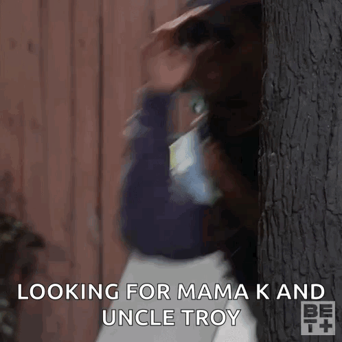 Brandon (Vince Swann) peeks from behind a tree, looking through binoculars for Mama K and Uncle Troy.