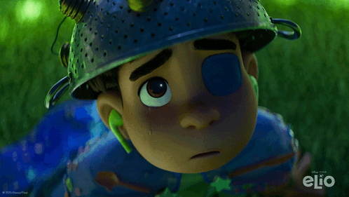 Elio Solis, wearing a colander helmet and eyepatch, looks up with a tear in his eye.