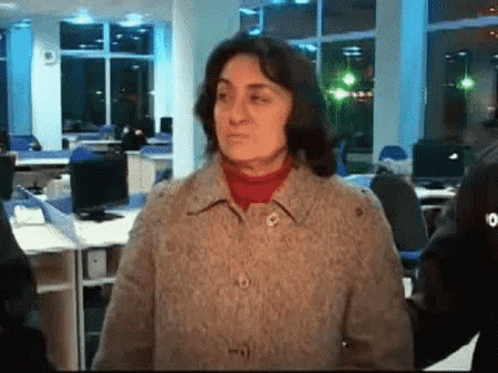 ვენერა ოძელაშვილი looking at the camera in an office setting, wearing a coat.