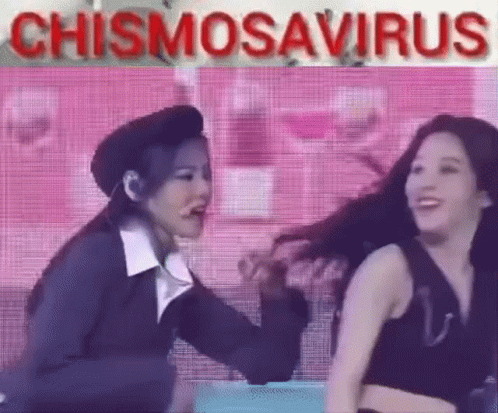 Loona members Heejin and Jinsoul reacting to 'Chismosavirus' on stage during a K-pop performance.