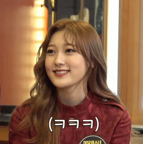 Loona member Choerry laughs heartily, wearing a red shirt, with Korean laughter text on screen.
